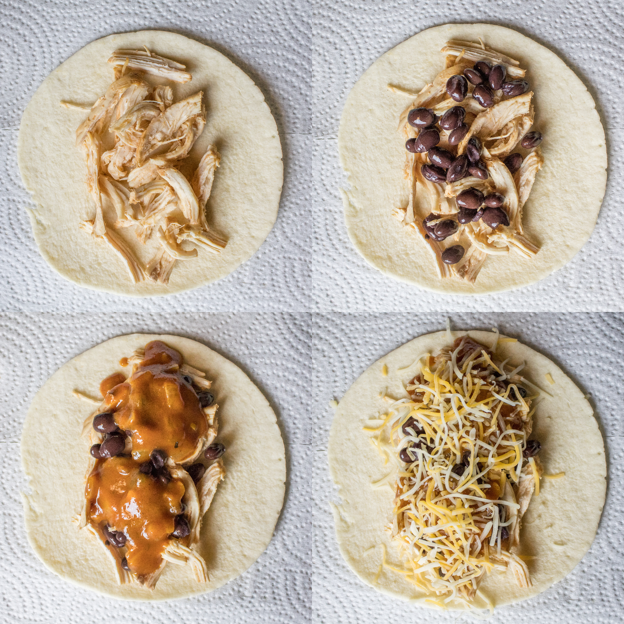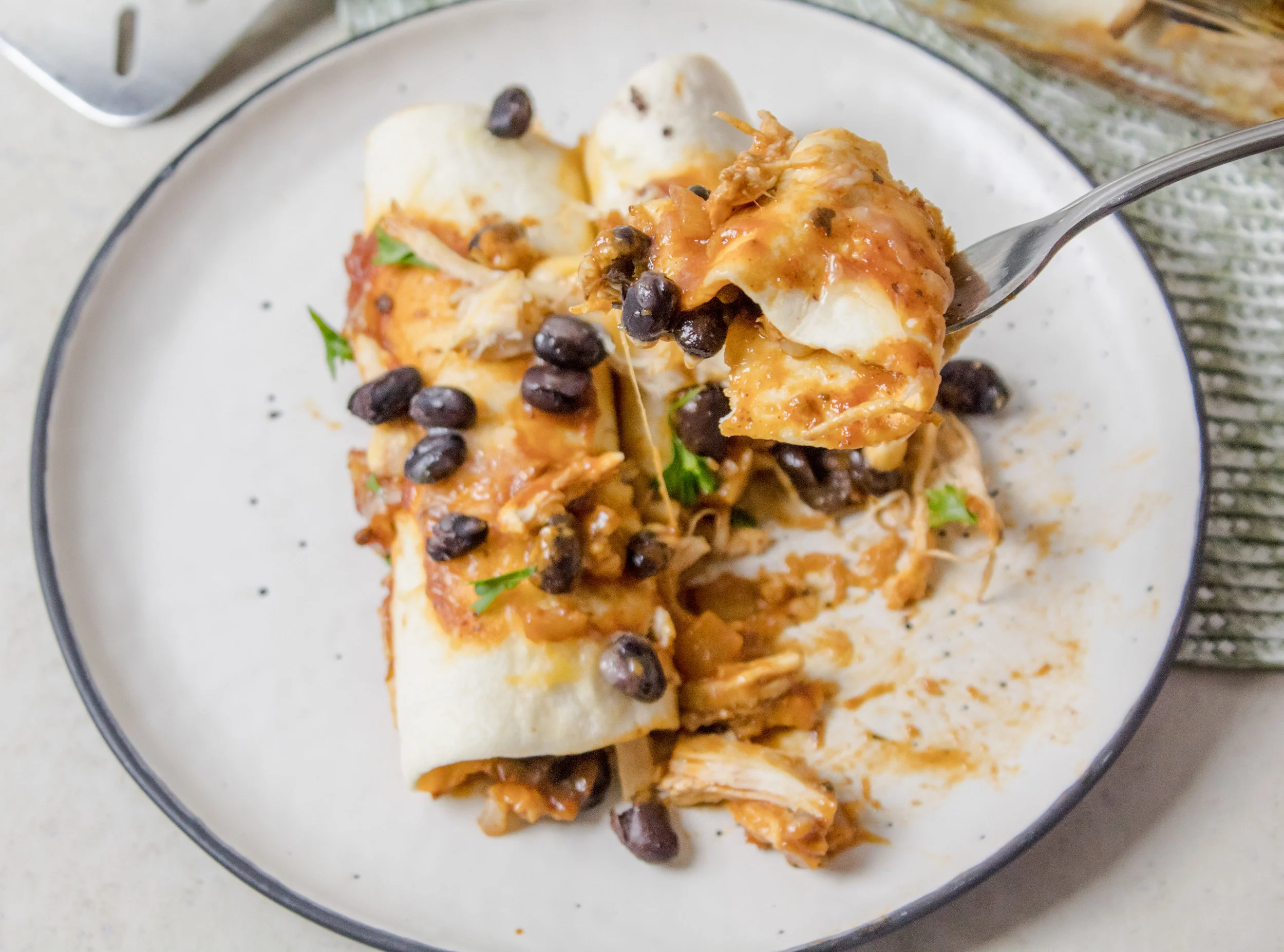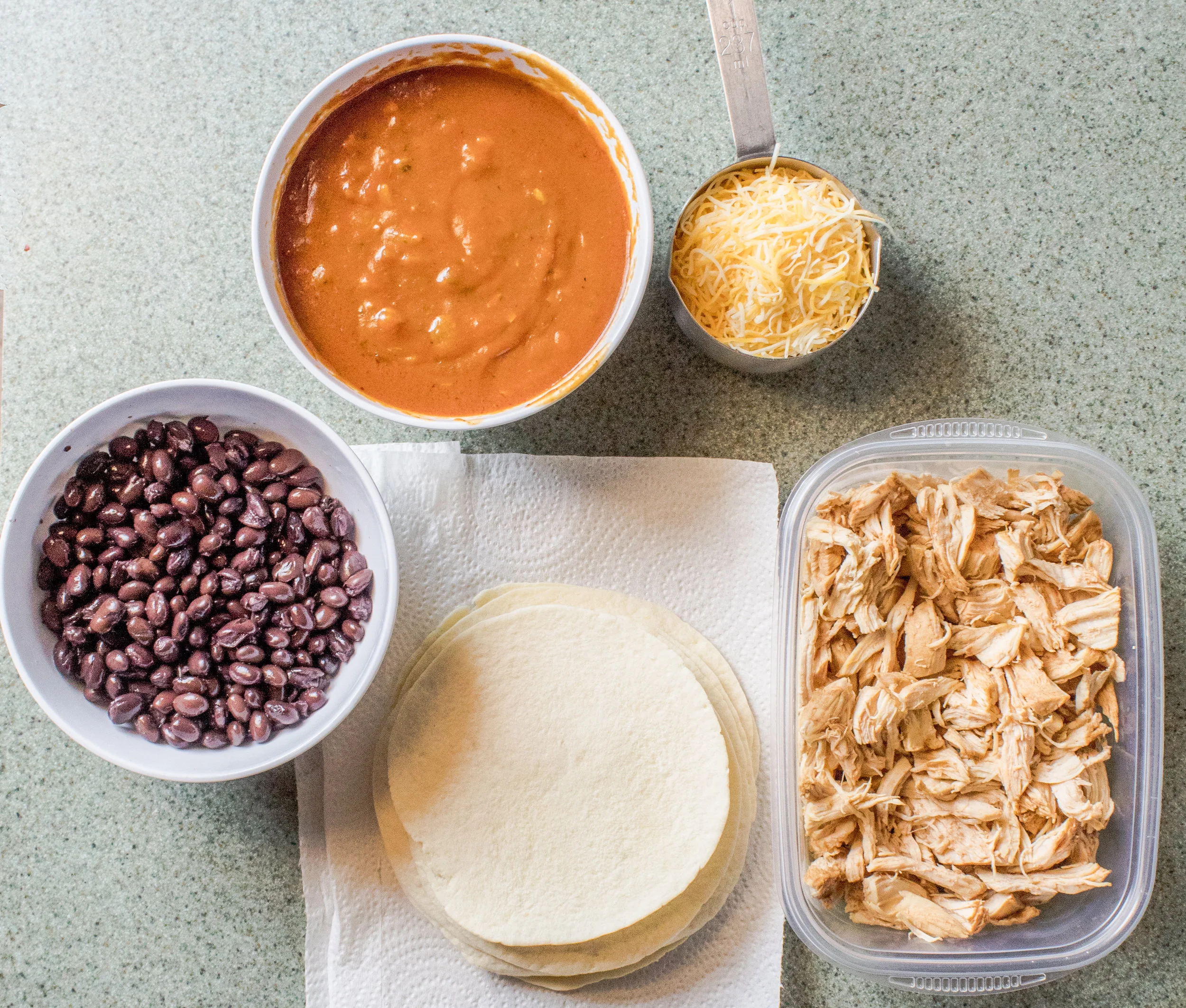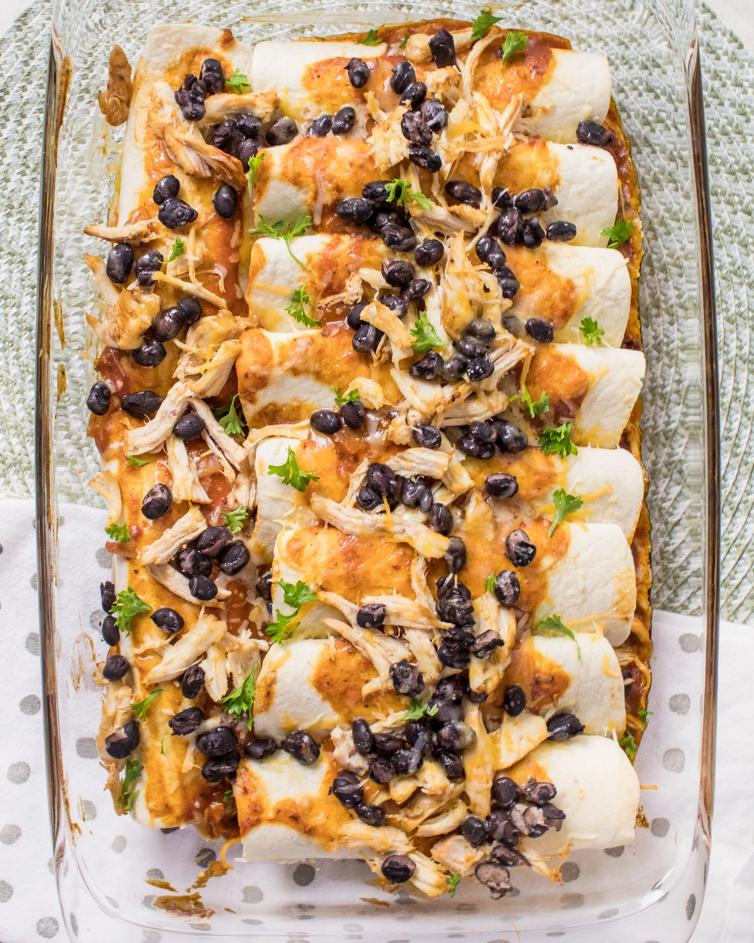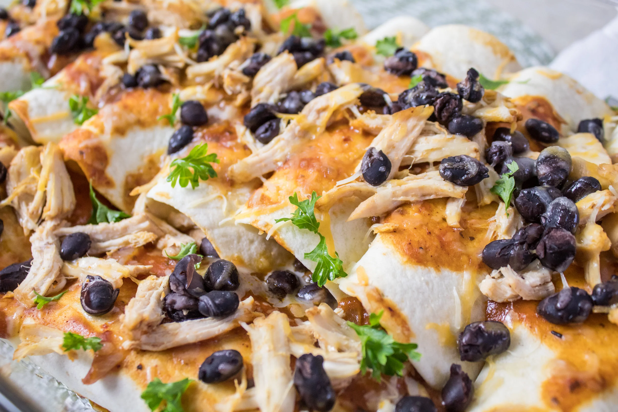- Set aside 1/3 cup of cheese. Layer a 13x9 inch baking dish with an even amount of enchilada sauce, just enough to coat the bottom of the pan. Place a soft tortilla on a flat surface and place shredded chicken in a line down the center. Cover chicken in enchilada sauce and top with beans and a small handful of cheese. Fold over each side of the tortilla and place in the baking dish, seam side down. Repeat for all 10 enchiladas. Cover enchiladas in remaining sauce that was set aside. Top enchiladas with beans then remaining cheese.
